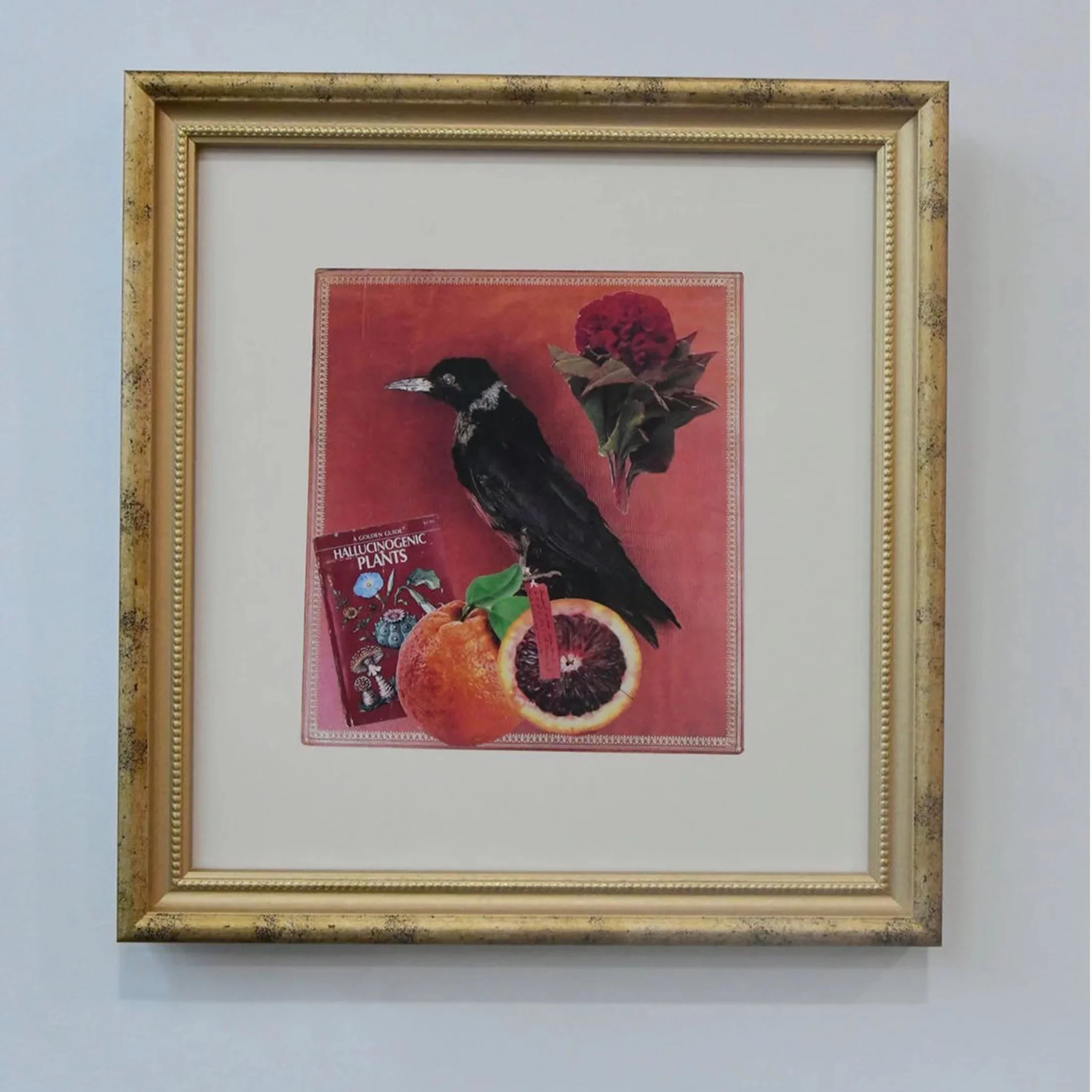 found printed material, glue, gold frame